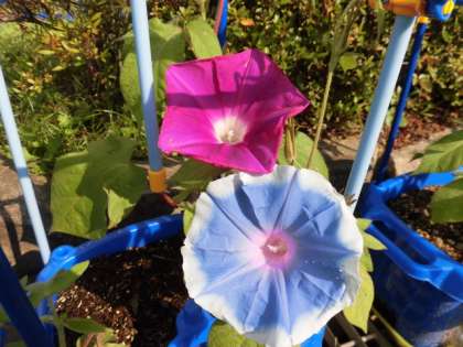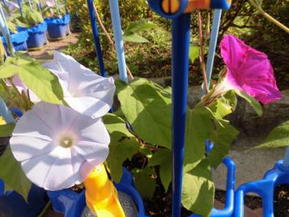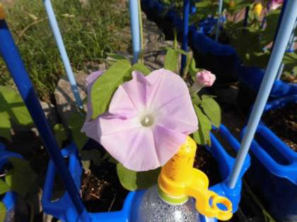 5月に植えたあさがおが花を咲かせました。ピンクに水色、紫といろいろな色の花が咲いています。まだ花が咲いていない子どもたちも「早く咲かないかな」「何色の花が咲くかな」と楽しみにしている様子です。