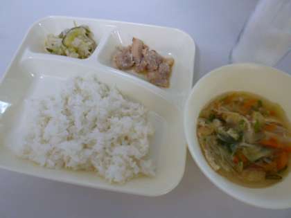 今日の献立は、ごはん、牛乳、鶏肉のしょうゆマヨネーズ焼き、五目汁、切り干しだいこんのゆずの香あえでした。