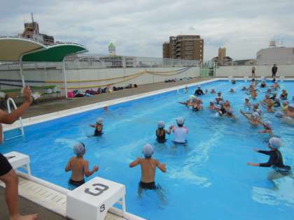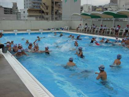 最後は「水中ポートボール」です。ボールを受け取ったら、すぐにパスをする、ボールを持っている人のボールは取らない等のルールをしっかり守り楽しくプレーできました。