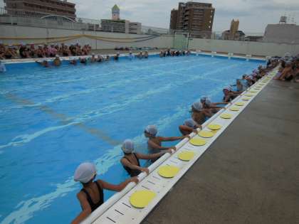 2種目めは、「走って、返して」です。プールの横をひたすら走って、自分のチームの色に板を返します。いったいプールを何往復したでしょうか。「疲れた!!」「いっぱい返した。」とみんな大興奮していました。結果は、1組が1位でした。