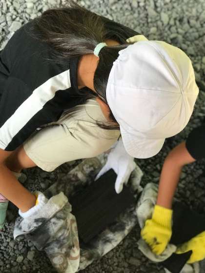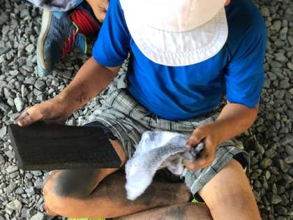 林間学習 焼き板を磨いています