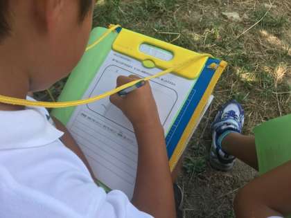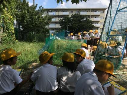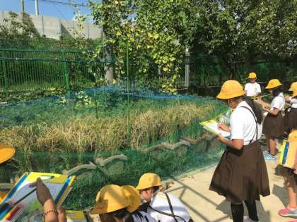 夏休み中にぐんぐんと成長した稲の観察を行いました。すっかり色が変わっていたり、稲穂が頭を垂れていたりとしばらく見ない間の大きな変化にみんなびっくりでした。