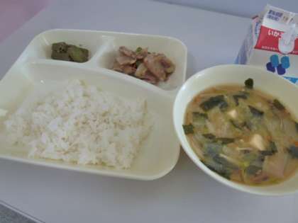 今日の献立は、ごはん、牛乳、豚肉の甘辛焼き、みそ汁、オクラのおかかいためでした。