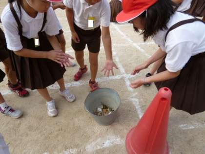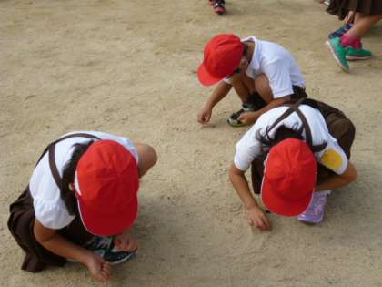 今日の児童集会では、運動会にむけて「石ひろい」を行いました。