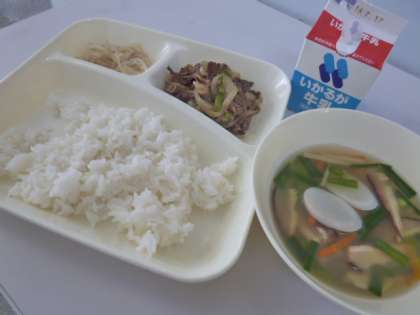 今日の献立は、ごはん、牛乳、プルコギ、トック、もやしの甘酢あえでした。