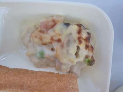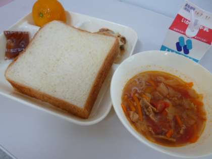 食パン、牛乳、豆乳マカロニグラタン、トマトスープ、冷凍みかん、いちごジャムでした。