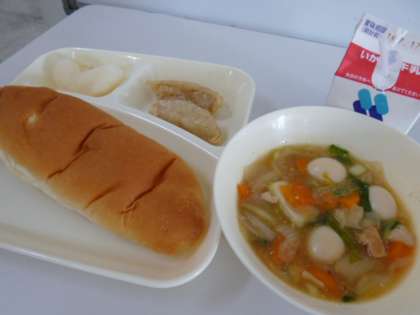 今日の献立は、おさつパン、牛乳、中華煮、あげギョーザ、なし(豊水)でした。