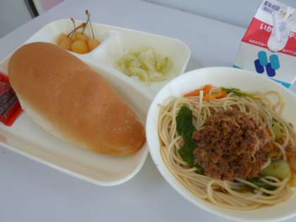 今日の献立は、コッペパン、牛乳、タンタンめん、キャベツの甘酢づけ、さくらんぼ(缶)、いちごジャムでした。