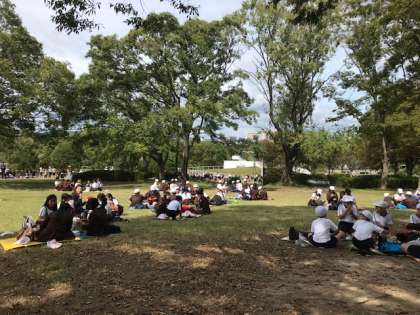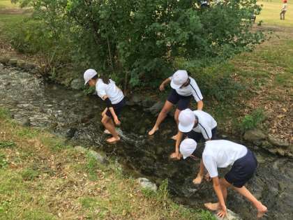 無事帰校しました。午後は楽しみにしていたお弁当とおやつをグループで楽しく食べ、その後おもいっきり草原や小川で遊びました。