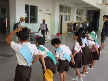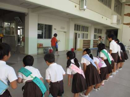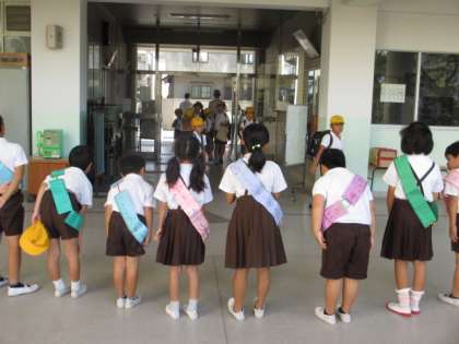 毎朝、ピロティ—に立ち元気よく挨拶をしています。