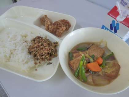 今日の献立は、ごはん、牛乳、鶏肉のたつたあげ、あつあげと野菜の煮もの、おかかなっ葉でした。