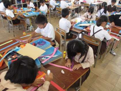 折ったり編んだり、丸めるなどあります。子どもたちは、色の組み合わせや少しアレンジするなど楽しんで意欲的に取り組んでいます(*^_^*)
