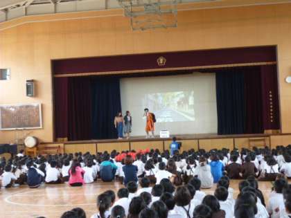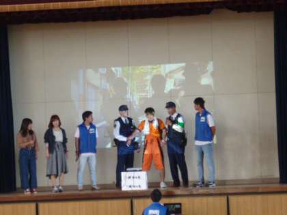 講堂での安全教室では、東淀川警察、見まもり隊の方々、そして、摂南大学の先生と学生さんが協力してくださいました。