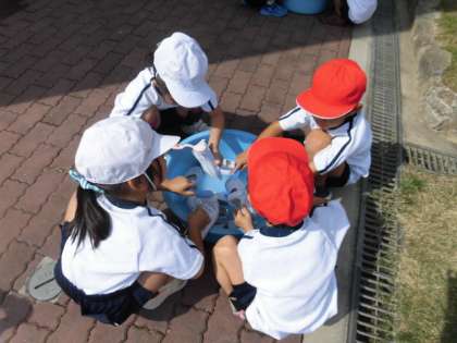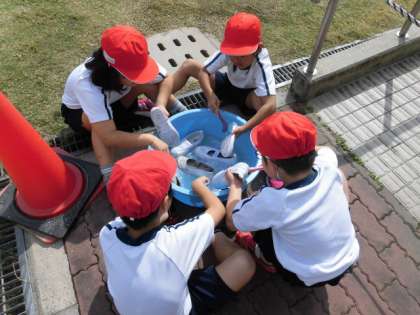 体育館シューズを洗っている途中に「水が黒くなってる」という声や「汚いところがとれたよー」といった声もあり、きれいになっていく体育館シューズを見てとても嬉しそうにしていました。