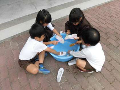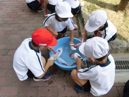体育館シューズを洗うための準備や後片付けも班のみんなと力を合わせてすることができました。洗い終わった後「つかれたー」「楽しかった!!」「家でも自分で洗う!!」と様々な声がありました。