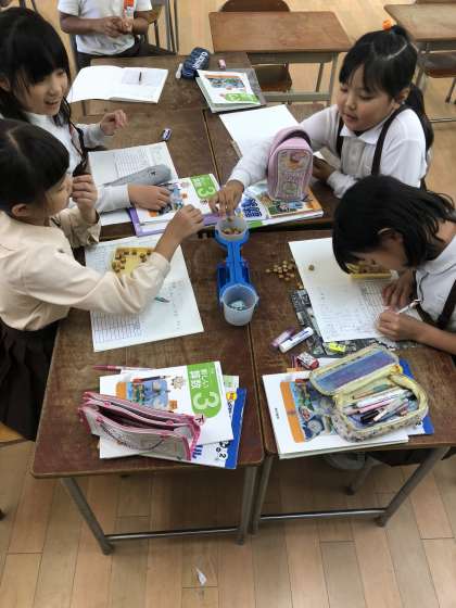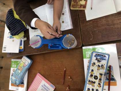 3年生の算数科では重さを勉強しています。てんびんの上に消しゴムやのりを置いて、ブロックいくつ分かをはかったり、一円玉では何枚分になるのかを調べたりしました。