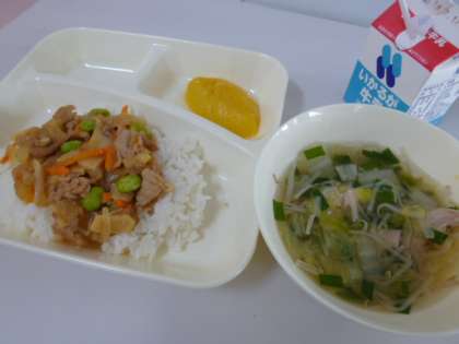 今日の献立は、ごはん、牛乳、ピリ辛丼、中華スープ、黄桃(缶)でした。