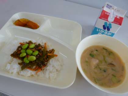 今日の献立は、ごはん、牛乳、もずくと豚ひき肉のジューシー、みそ汁、焼きかぼちゃの甘みつかけでした。