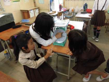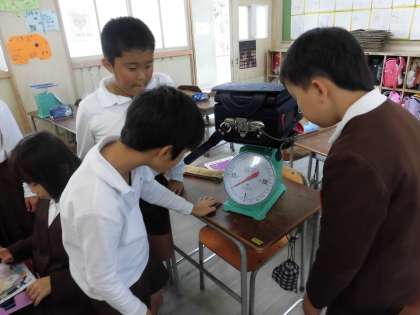てんびんに引き続き、3年生でははかりを使って色々なものの重さを測る活動をしています。空のランドセルと教科書を入れたランドセルを測って、その重さを比べる活動では、「うわー! 2キロ越え!」「コップ袋もついているから、これよりもっと重たいはず!」と歓声(悲鳴?)を上げていました。また、各教科の教科書の重さを比べてみて「教科書は理科が一番重たいけど、算数はドリルもあるから、一番ランドセルが重たい曜日は……」とふだんの生活に引き付けて考えている子どももいました。