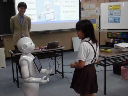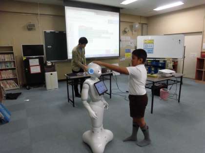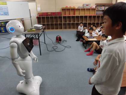 10月24日(水)プログラミングの体験授業をしました。最初にお話を聞いてペッパー君を触ったり、会話をしたりして遊びました。前に出てきた児童はとてもドキドキしながらペッパー君に質問をしたり、逆に質問をされたりしていました。会話する度に、クラスの友達から歓声が上がっていました。