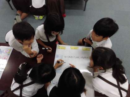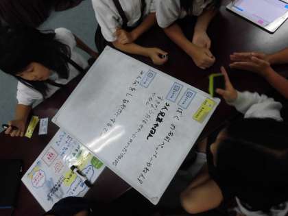 ペッパー君に自己紹介をしてもらうために、自己紹介の内容をホワイトボードで考えました。ペッパー君にどんなことを話してもらうかグループで一生懸命に考え、工夫する姿が素敵でした。中には関西弁でしゃべらせようとしたり、英語をしゃべらせようとしたりするグループもありました。