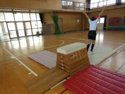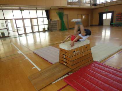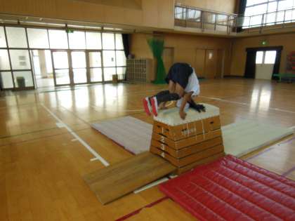 今日の講堂での体育はとび箱で台上前転をしました。最初はこわがっていた子どもが何人かいましたが、何度も練習することで、たくさんの子ども達が成功することができました。