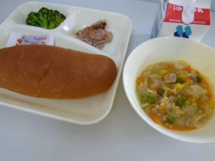今日の献立は、コッペパン、いちごジャム、牛乳、豚肉のガーリック焼き、マカロニと野菜のスープ、ブロッコリーのサラダです。