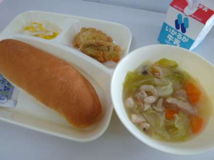 今日の献立は、コッペパン、牛乳、白身魚のフリッター、スープ煮、大根のピクルス、ブルーベリージャムでした。