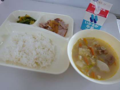 今日の献立は、ごはん、牛乳、豚肉のしょうがじょうゆかけ、けんちん汁、三度豆のからしじょうゆあえでした。