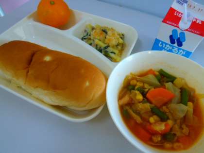 今日の献立は、おさつパン、牛乳、鶏肉と野菜のケチャップ煮、ほうれん草のグラタン、みかんでした。