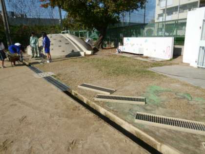 まずは力仕事。側溝の泥上げです。さすがは中学生。側溝がみるみる美しくなり、一輪車に乗せて運ぶのも楽々です。