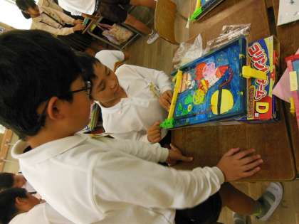 図画工作科で作ったコリントゲームで遊びました。友達のコリントゲームで楽しそうに遊んでいました。