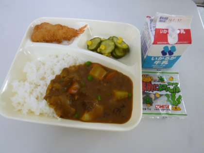 今日の献立は、ごはん、牛乳、エビフライカレーライス、きゅうりとコーンのサラダ、豆こんぶでした。