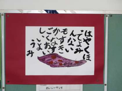 職員室前廊下と階段の掲示板、教室にサツマイモの絵を掲示しています。