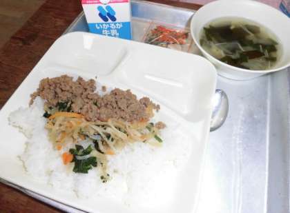 今日の献立は、ごはん、牛乳、ビビンバ、わかめスープ、アーモンドフィッシュでした。