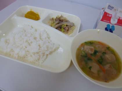 今日の献立は、ごはん、牛乳、豚肉とまいたけの炒め物、つみれ汁、かぼちゃういろう