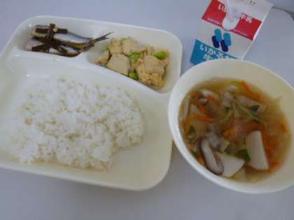 今日の献立は、ごはん、牛乳、いわしのしょうが煮、うずくず汁、高野どうふの卵とじでした。