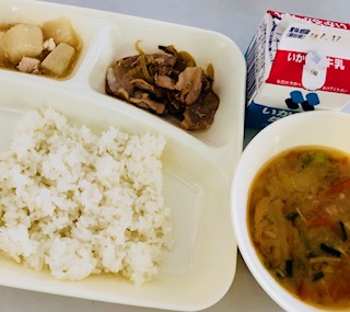 今日の献立は、ごはん、牛乳、豚肉のしょうが焼き、みそ汁、だいこんの煮ものでした。