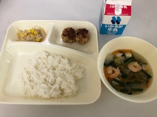 今日の献立は、ごはん、牛乳、揚げシューマイ、えびととうふのスープ、もやしとコーンのピリ辛あえでした。