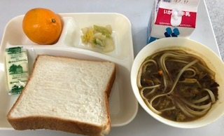 今日の献立は、食パン、牛乳、カレーうどん、はくさいのおひたし、みかん、マーガリンでした。