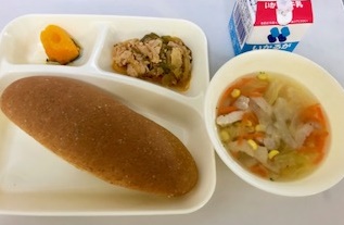 今日の献立は、ライ麦パン、牛乳、豚肉のケチャップソテー、はくさいのスープ、焼きかぼちゃでした。