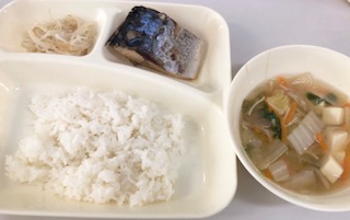 今日の献立は、ごはん、牛乳、さばのみそ煮、五目汁、もやしの甘酢あえでした。