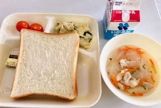 今日の献立は、食パン、バター、牛乳、ほたて貝のグラタン、だいこんのスープ、プチトマトでした。