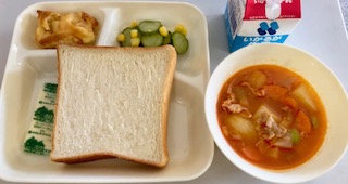 今日の献立は、食パン、マーガリン、牛乳、豚肉と野菜のケチャップ煮、きゅうりとコーンのサラダ、桃のクラフティでした。
