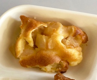 「桃のクラフティ」は、クラスごとの容器にコーンフレークを敷き、そこに小麦粉と卵とクリームを合わせた生地と白桃を混ぜ合わせて、コーンフレークの上に流し入れて、オーブンで焼いて作ります。