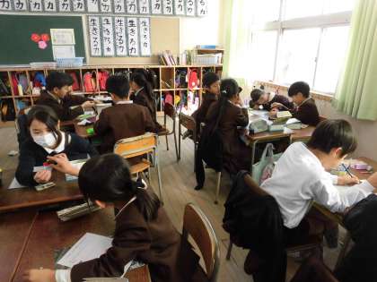 理科では磁石の勉強をはじめています。写真は、棒磁石のどの部分が強い磁力をもっているか調べている実験風景です。「両端はたくさんくっつくのに、真ん中にはくっつかない! なんで?」と不思議がる声がたくさんの子どもたちから上がっていました。