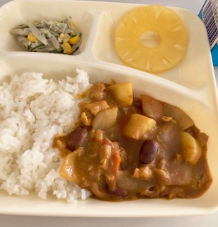 今日の献立は、金時豆のカレーライス、牛乳、ごぼうサラダ、パインアップル(缶)
