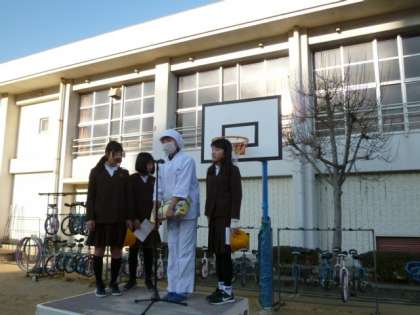 児童朝会にて、全校児童から調理員さんへの感謝の手紙を渡し、「いつも、おいしい給食をありがとうございます。」と、みんなでお礼を言いました。