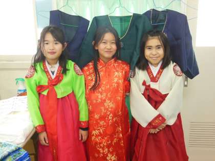 今日は身近な国に親しむ週間に取り組みました。チマチョゴリを着たり、テュホをしたり、中国コマをしたりと楽しく活動していました。