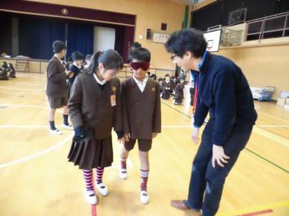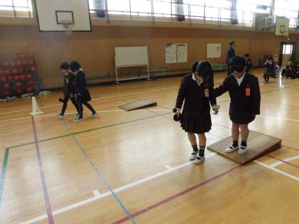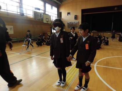 講師の先生方から正しい手引きの仕方を教えていただいた後、子どもたちはアイマスク体験をしました。アイマスクをつけると、「前が見えない!」と言いながら、足でゆっくりと点字ブロックをたどり、ペアの友だちに手引きしてもらって、体験コースを歩きました。「一人やったら、最後まで行かれへんかったと思う」「町の全部の道に点字ブロックがあったら、安心して出かけられるのになぁ」という体験したからこその意見が出ていました。